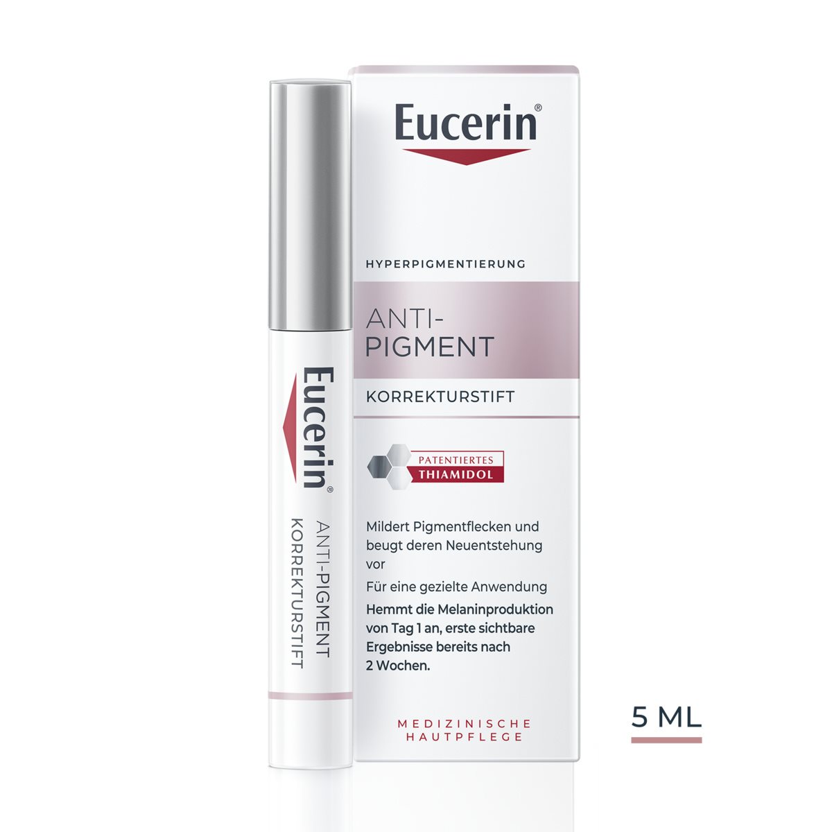 Der Eucerin® Anti-Pigment Korrekturstift ist ein nicht fettendes Gel mit einem präzisen Applikator, der eine leichte Anwendung auf kleine Bereiche von Hyperpigmentierungen ermöglicht. Das patentierte Thiamidol® bekämpft Pigmentflecken an ihrem Ursprung und mildert die Melaninproduktion von Tag 1 an mit ersten sichtbaren Ergebnisse nach zwei Wochen bei regelmäßiger Anwendung. Klinische und dermatologische Studien belegen, dass Pigmentflecken aller Art reduziert und ihrer Neuentstehung vorgebeugt wird. Für eine langfristig ebenmäßige Haut bei regelmäßiger Anwendung.