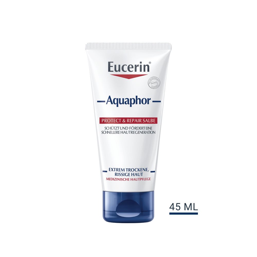 Eucerin Aquaphor Protect & Repair Salbe schützt, beruhigt und pflegt rissige, irritierte extrem trockene Haut und fördert eine schnellere Hautregeneration.