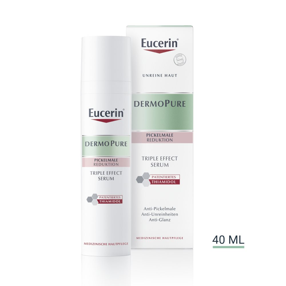 Der Hauptwirkstoff des Eucerin DermoPure Triple Effect Serum, Thiamidol, hat einen direkten Einfluss auf die Melaninsynthese, die eine postinflammatorische Hyperpigmentierung verursacht. In der Regel verblassen Pickelmale im Laufe der Zeit, dies kann jedoch mehrere Jahre dauern. Die Eucerin DermoPure Produkte gegen postinflammatorische Hyperpigmentierung unterstützen und beschleunigen diesen Prozess. Sind sie einmal verschwunden, treten Pickelmale in der Regel nicht wieder auf. Dennoch sollten die DermoPure Produkte auch nach dem Verblassen von Pickelmalen so lange weiter verwendet werden, wie die Haut zu Unreinheiten neigt, um eine Neuentstehung zu verhindern.