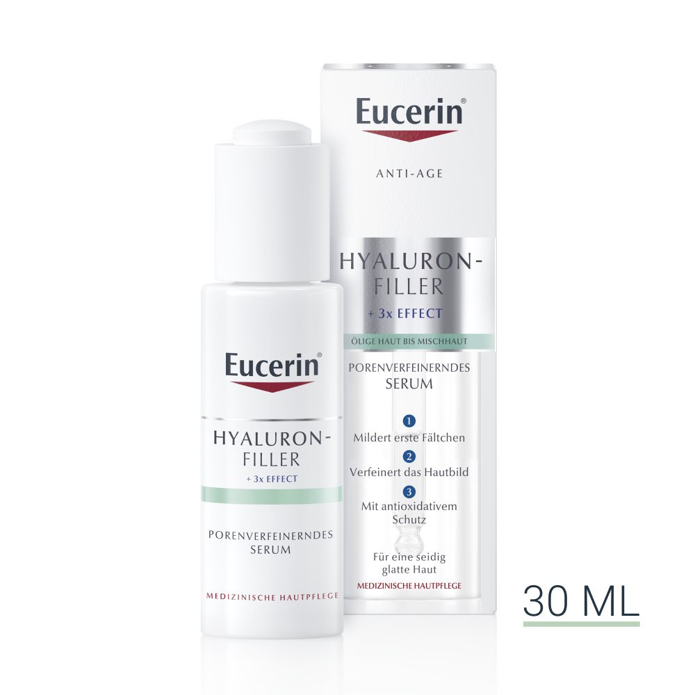 Das Eucerin Hyaluron-Filler + 3x Effect Porenverfeinerndes Serum von Eucerin ist ultra-leicht und enthält drei wichtige Wirkstoffe: Hyaluronsäure, Glycolsäure und Milchsäure. Diese Pflegewirkstoffe machen die Haut seidig-glatt. Zusätzlich schützt sie die Formel mit Antioxidantien vor freien Radikalen.