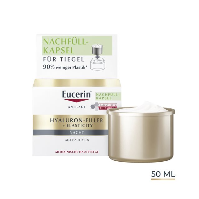 Eucerin Hyaluron-Filler + Elasticity Nachtpflege mildert tiefe Falten und Pigmentflecken, verbessert die Elastizität der Haut und stärkt die Hautstruktur über Nacht.