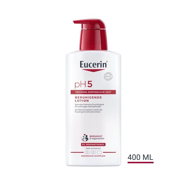 Die Eucerin pH5 Beruhigende Lotion ist eine sanfte, aber wirksame Körperpflege, die speziell entwickelt wurde, um trockene, empfindliche Haut zu stärken und widerstandsfähiger zu machen. Das einzigartige Eucerin pH Balance System mit dem pH5 Citratpuffer stellt den natürlichen pH-Wert der Haut wieder her. Gleichzeitig hilft 5% Dexpanthenol (Provitamin B5) die Regeneration der Haut zu stimulieren und deren Widerstandskraft zu bewahren.