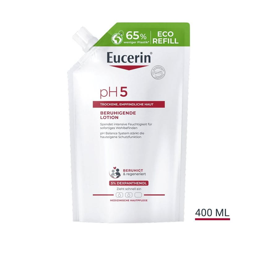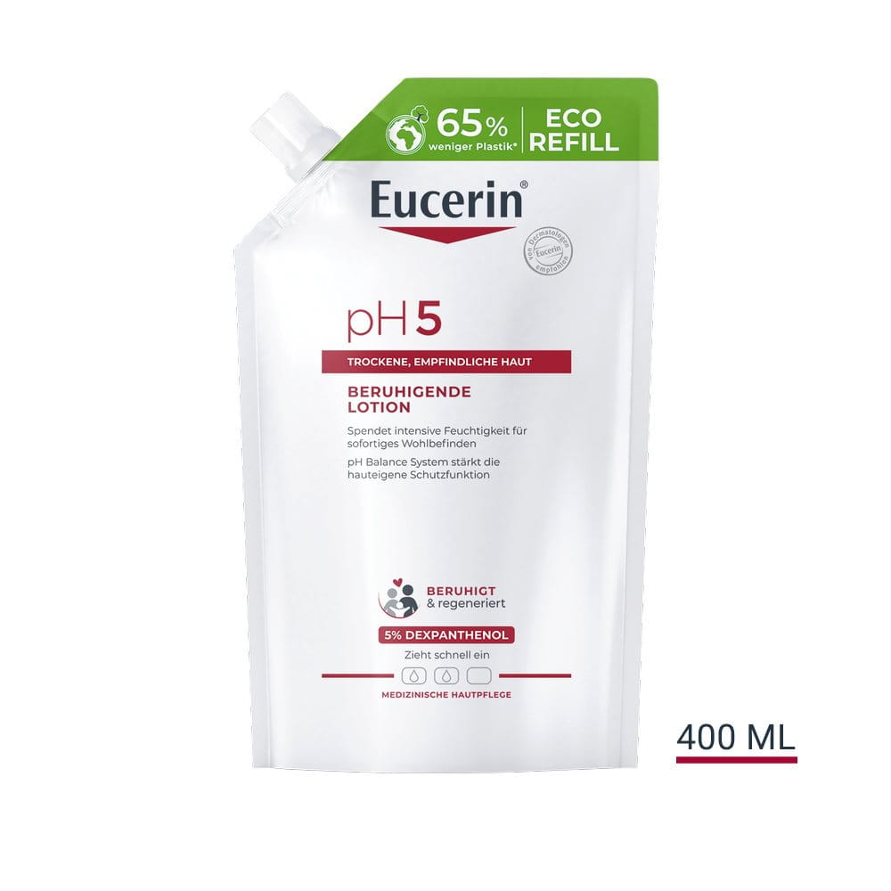 Die Eucerin pH5 Beruhigende Lotion ist eine sanfte, aber wirksame Körperpflege, die speziell entwickelt wurde, um trockene, empfindliche Haut zu stärken und widerstandsfähiger zu machen. Das einzigartige Eucerin pH Balance System mit dem pH5 Citratpuffer stellt den natürlichen pH-Wert der Haut wieder her. Gleichzeitig hilft 5% Dexpanthenol (Provitamin B5) die Regeneration der Haut zu stimulieren und deren Widerstandskraft zu bewahren.