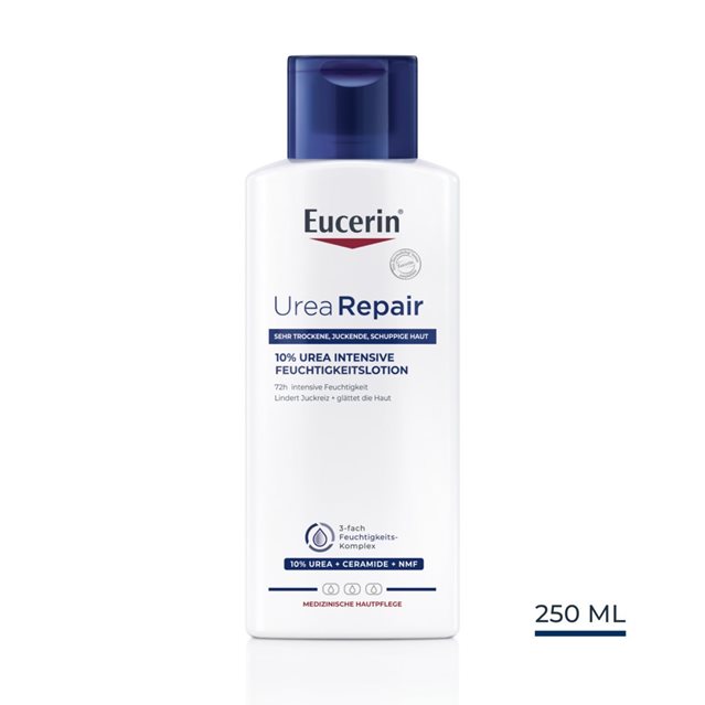 Wenn unsere Haut über eine stabile Barrierefunktion verfügt, schützt sie uns vor dem Eindringen von äußeren Reizstoffen und sorgt so für einen gesunden Feuchtigkeitsgehalt der Haut. Wenn diese Hautbarriere jedoch beschädigt ist, kann Feuchtigkeit aus der Haut entweichen und dadurch trocken aussehen und sich trocken anfühlen. Die Eucerin UreaRepair 10% Urea Intensive Feuchtigkeitslotion versorgt sehr trockene, raue Haut mit der täglichen Pflege die sie braucht. Es beinhaltet eine einzigartige Formel mit einem 3-fachem Feuchtigkeits-Komplex - 10% Urea, Ceramide und andere Natürliche Feuchthaltefaktoren (NMF) - für sofortige Linderung von Zeichen extrem trockener Haut: Juckreiz, Schuppung, Rötung, Rauheit und Spannungsgefühl. 1) 10% Urea spendet intensiv Feuchtigkeit und glättet die Haut 2) Natürliche Feuchthaltefaktoren (NMF) verbessern die Feuchtigkeitsbindung, wodurch der Feuchtigkeitsgehalt deutlich erhöht wird, und Glyceryl Glucosid sorgt für eine verbesserte Feuchtigkeitsverteilung 3) In Kombination mit Lipiden, wie z.B. Ceramiden, wird die hauteigene Schutzbarriere gestärkt und die Feuchtigkeit eingeschlossen. Das Ergebnis: 72h intensive Feuchtigkeit und Stärkung der schützenden Hautbarriere. ■ Die Haut fühlt sich angenehm glatt und geschmeidig an ■ Die Haut wird sanft abgeschuppt und geglättet ■ Die Wasser-in-Öl Emulsion zieht schnell ein und klebt nicht ■ Die Haut ist widerstandsfähig und dadurch langanhaltend vor Trockenheit geschützt ■ Ohne Duftstoffe Die Feuchtigkeitslotion ist sowohl für reifere Haut als auch bei Psoriasis, Diabetes und Keratosis Pilaris und als begleitende Pflege geeignet.